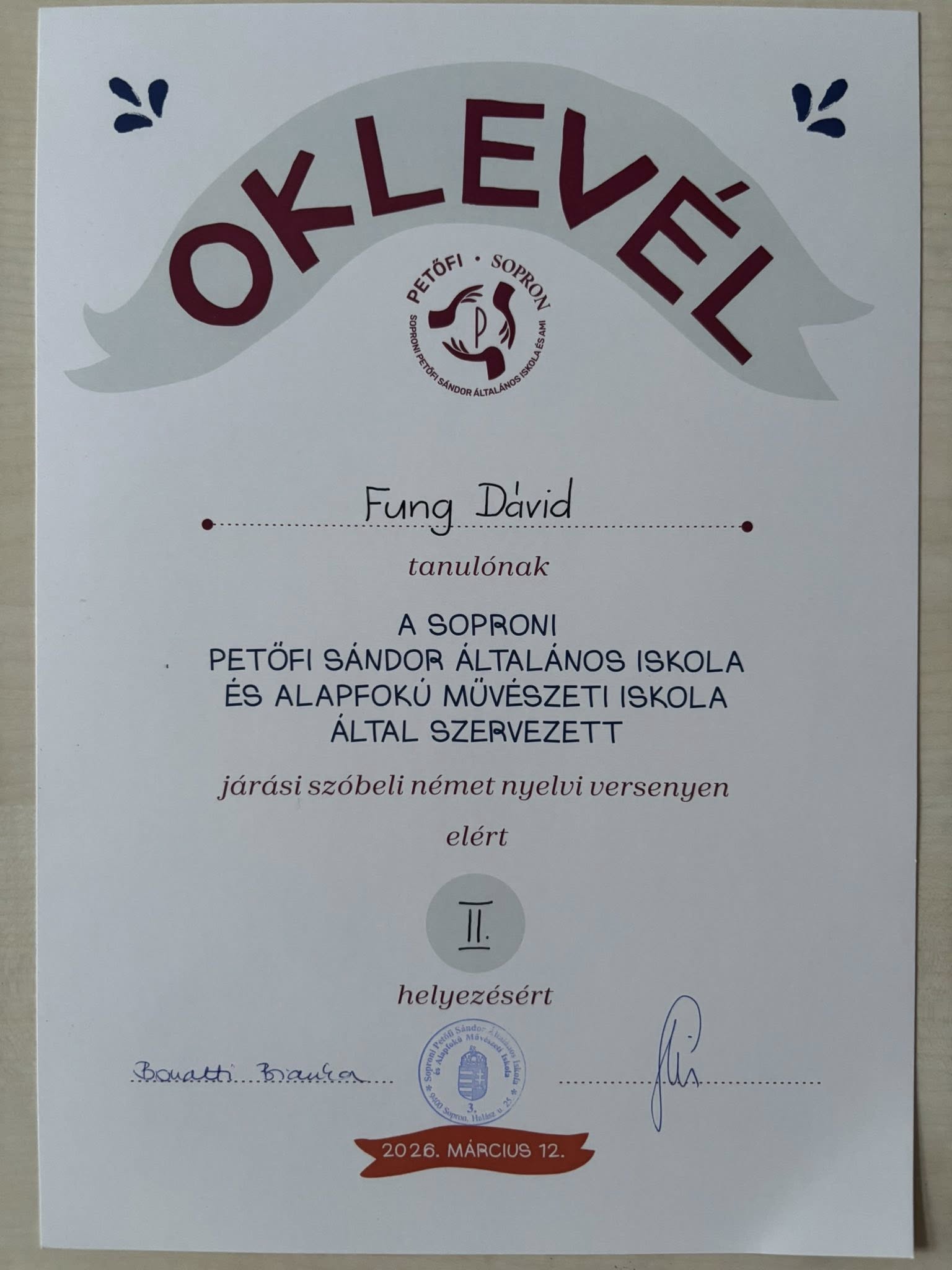 - a hit- és erkölcstan oktatás megszervezését vállaló egyházközség megnevezése: Soproni Református Egyházközség (Magyarországi Református Egyház)